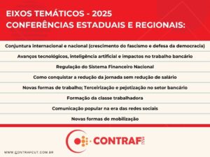 “As conferências regionais e estaduais fazem parte de um conjunto de ações para garantir a representatividade da categoria nas mesas de negociação com os bancos e que culminam na Conferência Nacional. A Consulta Nacional dos Bancários, que realizamos todos os anos, por exemplo, faz parte dessas ações. Em todas essas instâncias nós vamos construindo as pautas que são fundamentais na luta da categoria bancária pela manutenção dos direitos conquistados há três décadas na CCT e para avançarmos em novos direitos”, pontua Juvandia.