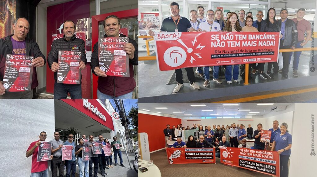 Nesta terça-feira (12), bancários de todo o Brasil participaram do Dia Nacional de Luta contra as demissões e o fechamento de agências do Bradesco. A mobilização, organizada pela Confederação Nacional dos Trabalhadores do Ramo Financeiro (Contraf-CUT) e pelas federações e sindicatos filiados, levou faixas, cartazes e mensagens de protesto às portas de diversas unidades do banco.