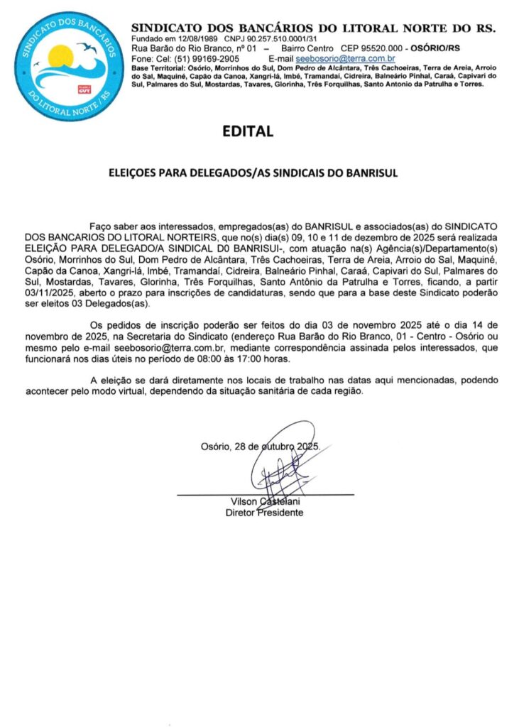 EDITAL: ELEIÇÕES PARA DELEGADOS(AS) SINDICAIS BANRISUL