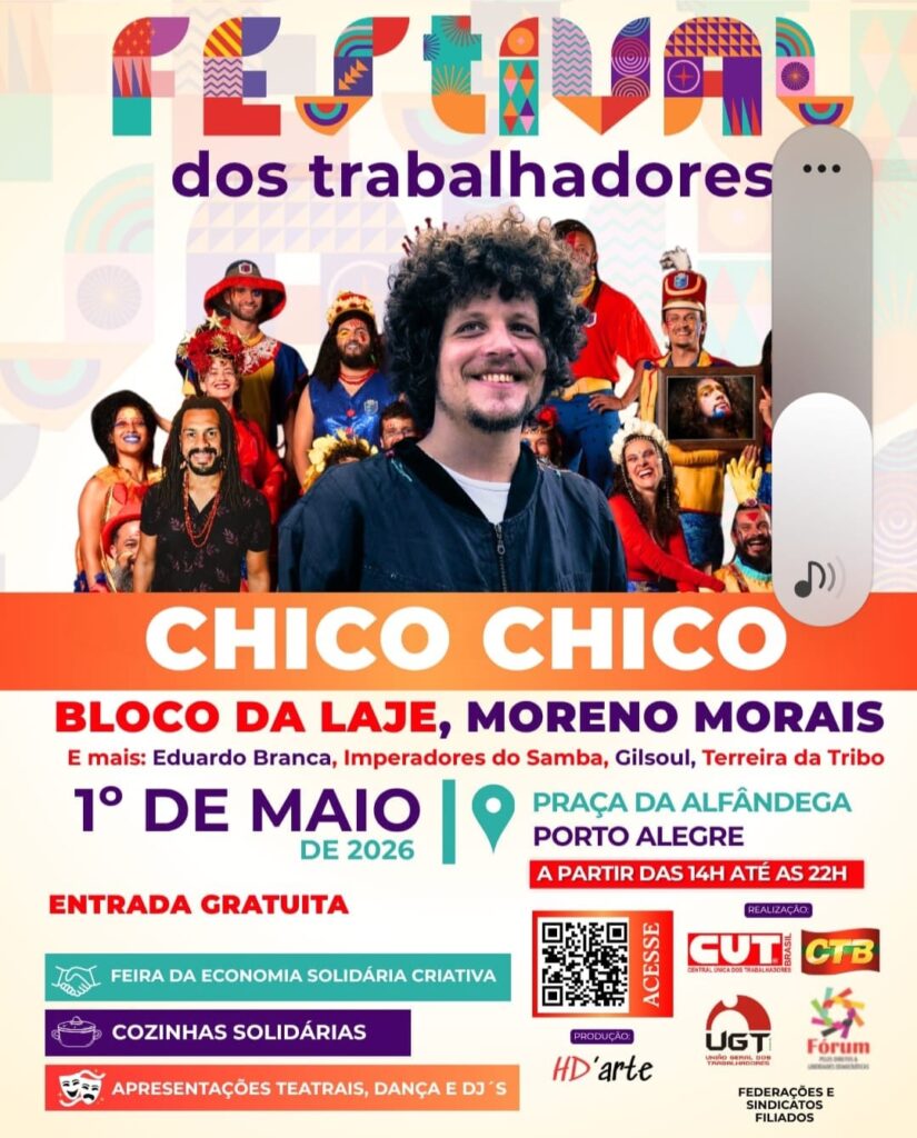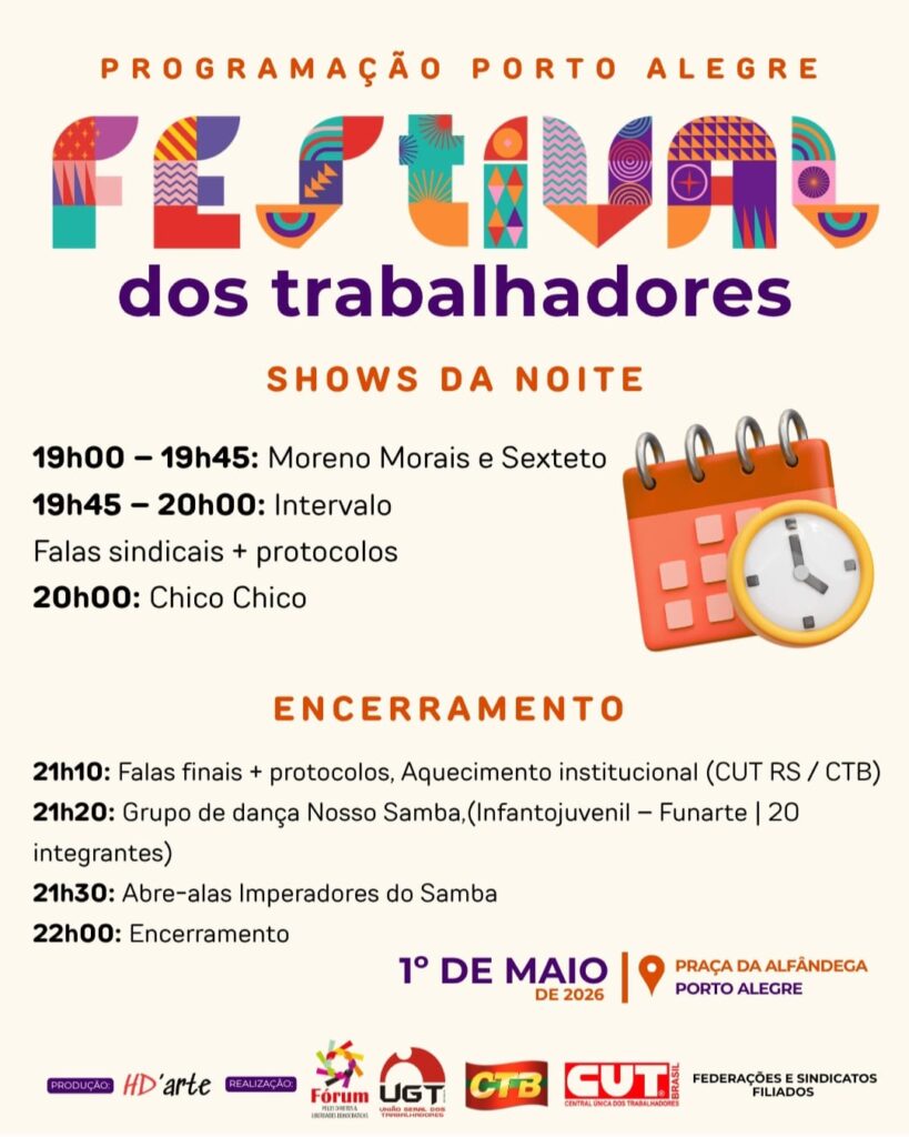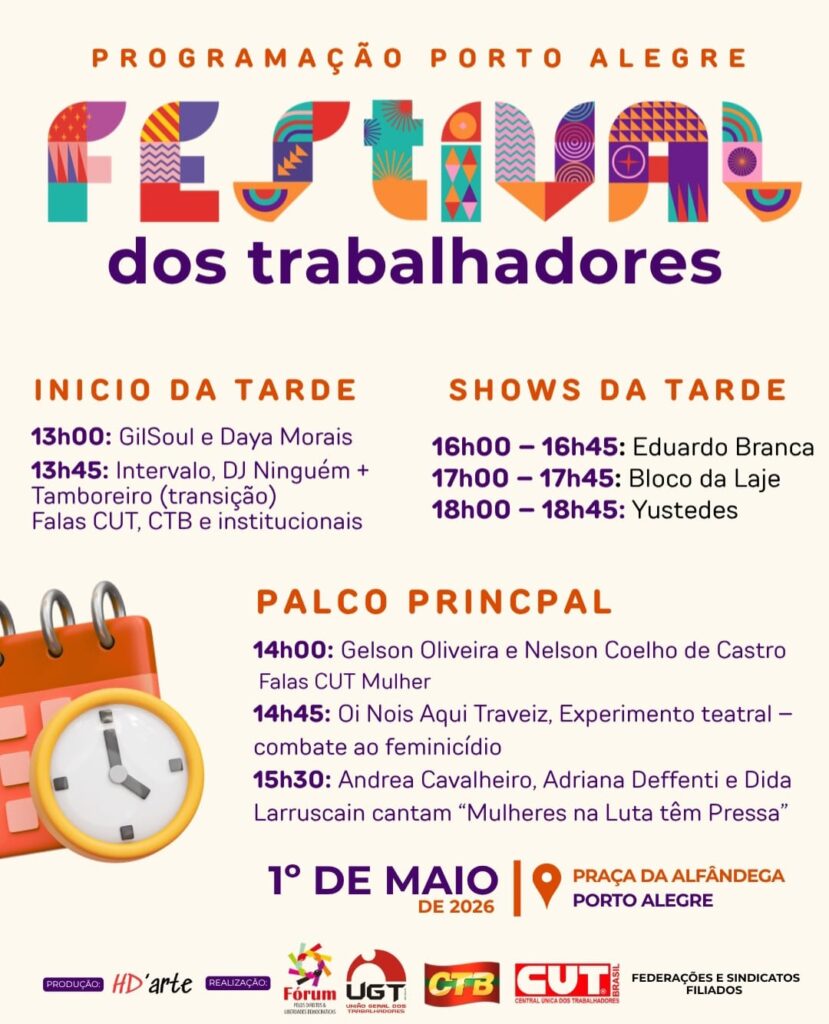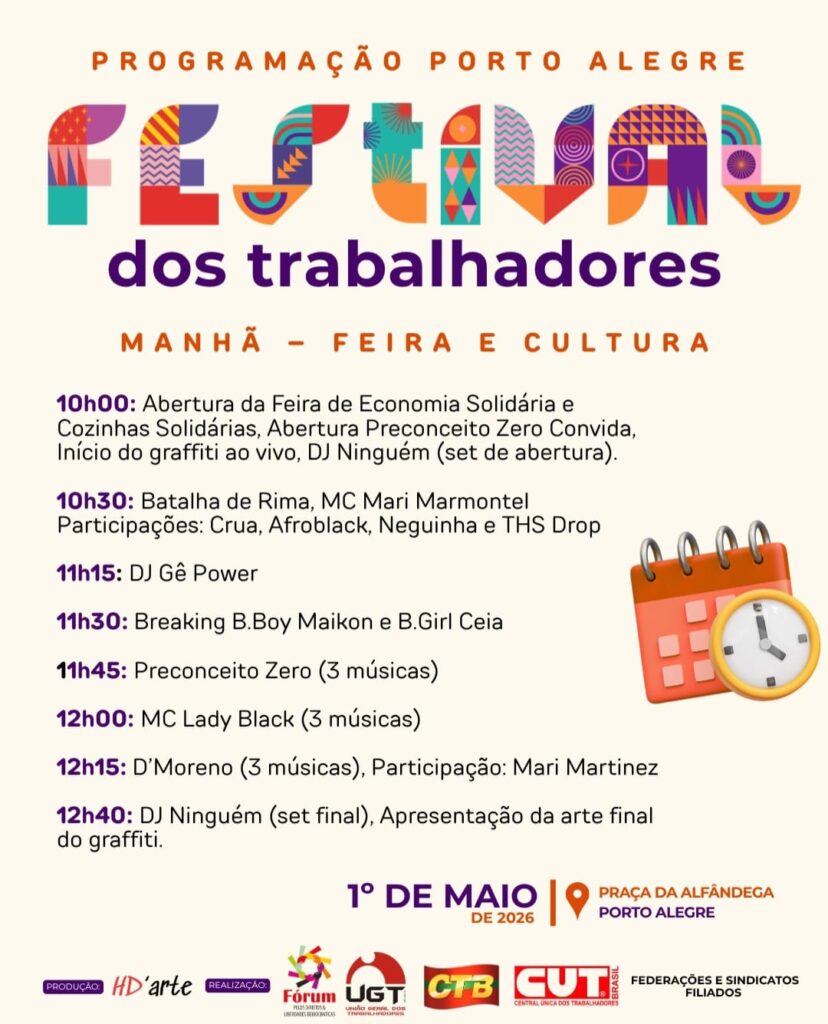 Pessoal estaremos participando no Festival dos Trabalhadores na próxima semana alusivo ao 1° de Maio,em Poa na Praça da Alfândega. Evento inicia às 14h até às 22h com as atrações abaixo. Se tiver interesse entre em contato conosco